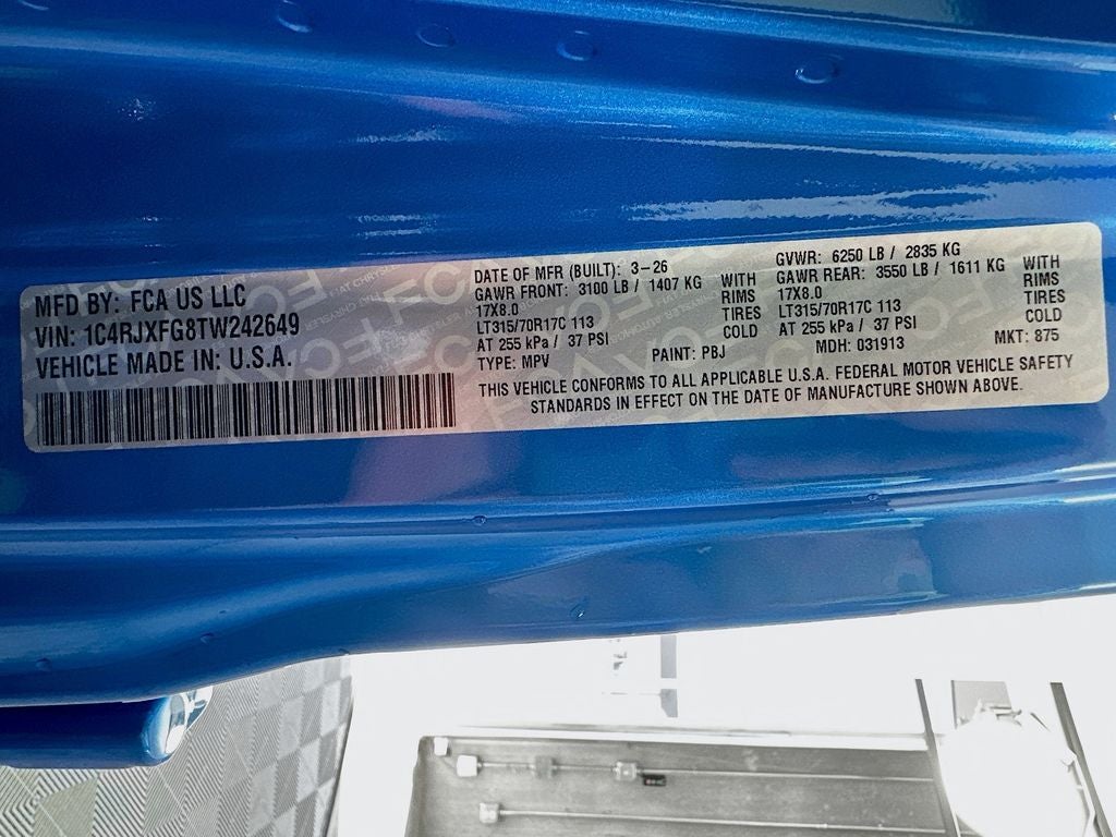 12.3 Touchscreen Display, 1941 Side Decals, 35 Tire Suspension, 4-Wheel Disc Brakes, 4G LTE Wi-Fi Hot Spot, 8 Speakers, ABS brakes, Acoustic Front Seat Area Carpet, Acoustic Laminated Front Door Glass, Air Conditioning, Alloy wheels, Alpine Premium Audio System, AM/FM radio: SiriusXM with 360L, Apple CarPlay, Apple CarPlay/Android Auto, Auto High Beam Headlamp Control, Auto-Dimming Rear-View Mirror, Automatic temperature control, Aux Battery, Auxiliary Switches, Blind Spot and Cross Path Detection, Body Color 3-Piece Hard Top, Body Color Rubicon Highline Flare, Brake assist, Class II Receiver Hitch, Cloth Low-Back Bucket Seats, Compass, Connected Travel and Traffic Services, Connectivity - US/Canada, Delay-off headlights, Driver door bin, Driver vanity mirror, Dual front impact airbags, Dual front side impact airbags, Electronic Stability Control, Emergency communication system: Jeep Connect, For More Info, Call 800-643-2112, Freedom Panel Storage Bag, Front anti-roll bar, Front Bucket Seats, Front Center Armrest w/Storage, Front dual zone A/C, Front fog lights, Front License Plate Bracket, Front reading lights, Fully automatic headlights, Google Android Auto, Gray/Black Trail Rated Badge, HD Radio, Heated door mirrors, Heated Front Seats, Heated Steering Wheel, Illuminated entry, Integrated Center Stack Radio, Integrated Off-Road Camera, Integrated roll-over protection, Integrated Voice Command with Bluetooth®, Leather Wrapped Park Brake Handle, Leather Wrapped Shift Knob, Low tire pressure warning, Matte Black Jeep Badge, MOPAR All-Weather Floor Mats, MOPAR Hardtop Headliner, MOPAR Hinge-Gate Reinforcement, Nappa Leather Seats, No Soft Top, Non-Lock Fuel Cap Without Discriminator, Occupant sensing airbag, Outside temperature display, Overhead airbag, Panic alarm, ParkSense Rear Park Assist System, ParkView Rear Back-Up Camera, Passenger door bin, Passenger vanity mirror, Performance Hood, Performance Suspension, Power 4-Way Driver Lumbar Adjust, Power 4-Way Passenger Lumbar Adjust, Power Adjust 8-Way Driver Seat, Power Adjust 8-Way Front Passenger Seat, Power door mirrors, Power steering, Power windows, Premium Door Trim Panel, Quick Order Package 24Y Rubicon X, Radio data system, Radio: Uconnect 5 Navigation with 12.3 Display, Radio: Uconnect 5 with 12.3 Display, Rear anti-roll bar, Rear reading lights, Rear Window Defroster, Rear Window Wiper/Washer, Remote keyless entry, Security system, SiriusXM Radio Service, SiriusXM with 360L, Speed control, Split folding rear seat, Steel Front Bumper, Steel Performance Hood Package, Steel Rear Bumper, Steering wheel mounted audio controls, Stop-Start Dual Battery System, Tachometer, Telescoping steering wheel, Tilt steering wheel, Traction control, Trailer Tow and Auxiliary Switch Group, Trailer Tow Prep Package, Trip computer, Universal Garage Door Opener, Variably intermittent wipers, Voltmeter, Wheels: 17 x 7.5 Machined/Painted Black, Wheels: 17 x 8 Machined with Black Pockets, White 3-Piece Hard Top, White Grille with Neutral Gray Metallic Rings, Whitecap Package.