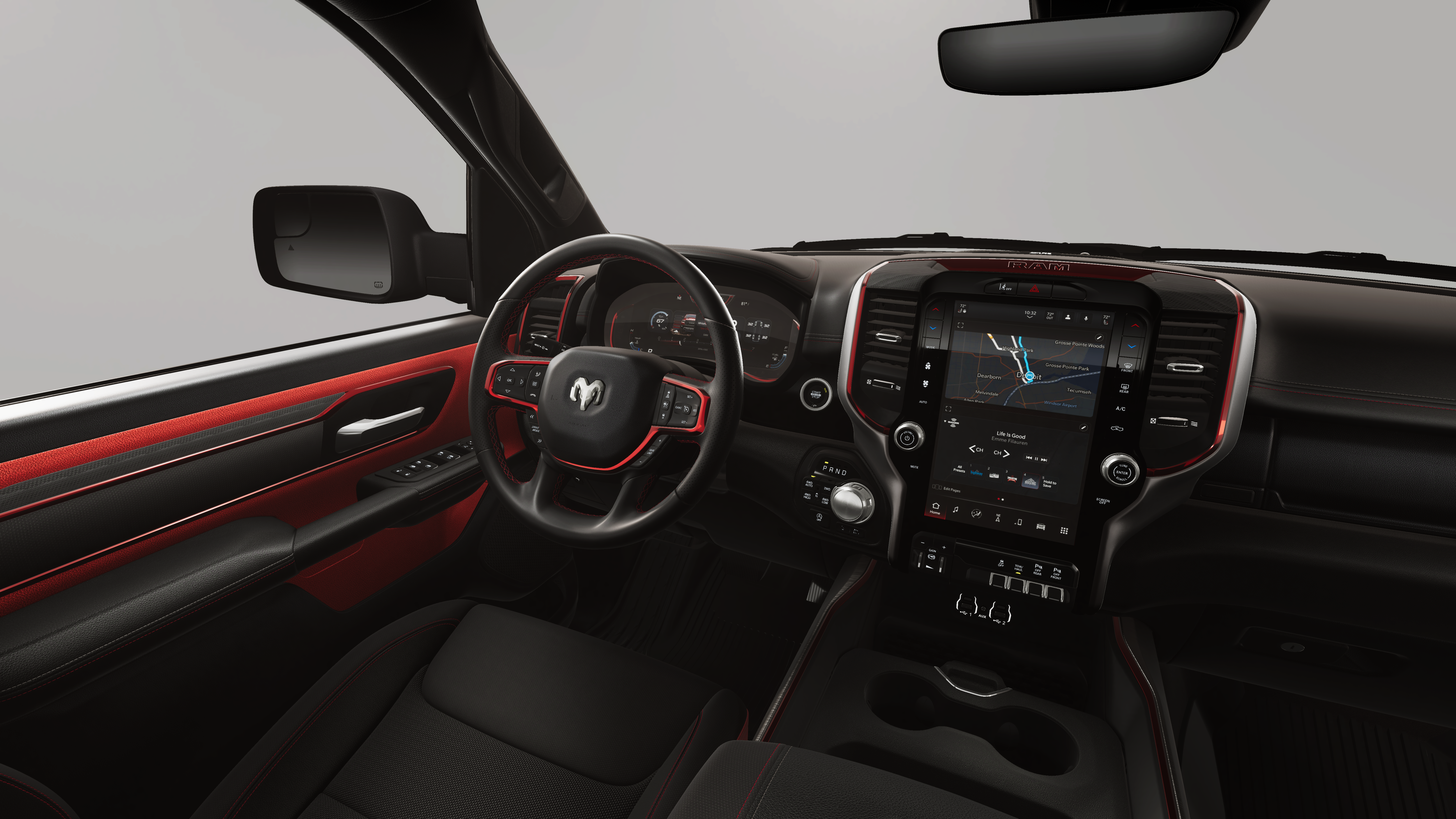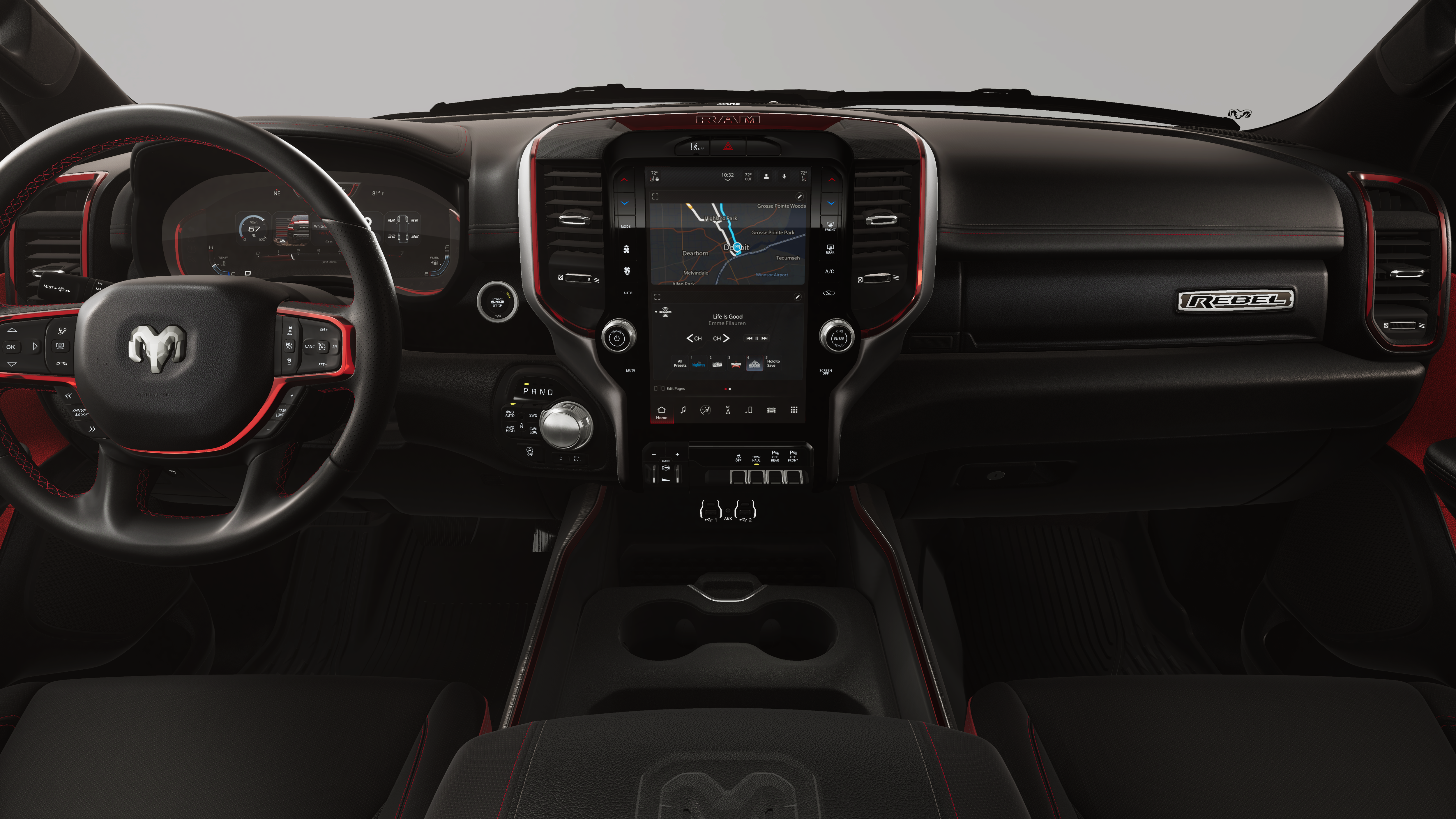 10 Speakers, 3.92 Rear Axle Ratio, 4 Way Front Headrests, 4-Wheel Disc Brakes, 4G LTE Wi-Fi Hot Spot, ABS brakes, Active Noise Control System, Air Conditioning, Alloy wheels, AM/FM radio: SiriusXM with 360L, Apple CarPlay, Apple CarPlay/Android Auto, Auto High-beam Headlights, Auto Power-Folding Mirrors, Auto-Dimming Exterior Driver Mirror, Auto-dimming Rear-View mirror, Automatic temperature control, Bed Utility Group, Black Exterior Mirrors, Black Premium Power Mirrors, Brake assist, Bucket Seats, Cloth/Vinyl Bucket Seats, Compass, Connected Travel and Traffic Services, Connectivity - US/Canada, Convex Wide-Angle Exterior Mirror Insert, Delay-off headlights, Disassociated Touchscreen Display, Driver door bin, Driver vanity mirror, Dual front impact airbags, Dual front side impact airbags, Electronic Stability Control, Exterior 115V AC Outlet, Exterior Mirrors Courtesy Lamps, Exterior Mirrors with Heating Element, Exterior Mirrors with Supplemental Signals, Front anti-roll bar, Front Bucket Seats, Front Center Armrest w/Storage, Front dual zone A/C, Front fog lights, Front License Plate Bracket, Front reading lights, Front Seat Back Map Pockets, Front wheel independent suspension, Full Length Upgraded Floor Console, Fully automatic headlights, Garage door transmitter, Global Telematics Box Module, Google Android Auto, GPS Antenna Input, GPS Navigation, HD Radio, Heated door mirrors, Heated Front Seats, Heated front seats, Heated Steering Wheel, Heated steering wheel, Illuminated entry, Integrated Center Stack Radio, Integrated Voice Command with Bluetooth®, Leather steering wheel, Low tire pressure warning, Manual Folding Exterior Mirrors, MOPAR 4 Adjustable Cargo Tie-Down Hooks, MOPAR Spray in Bedliner, Navigation System, Occupant sensing airbag, Off-Road Information Pages, Outside temperature display, Overhead airbag, Overhead console, Panic alarm, ParkView Rear Back-Up Camera, Passenger door bin, Passenger vanity mirror, Power 2-Way Driver Lumbar Adjust, Power Adjust 8-Way Driver Seat, Power Adjustable Pedals, Power door mirrors, Power driver seat, Power steering, Power windows, Quick Order Package 21W Rebel, Radio data system, Radio: Uconnect 5 Navigation with 12.0 Display, Rear 60/40 Folding Seat, Rear anti-roll bar, Rear seat center armrest, Rear step bumper, Rear Window Defroster, Rebel Level 1 Equipment Group, Remote keyless entry, Remote Tailgate Release, SiriusXM Radio Service, SiriusXM with 360L, Speed control, Split folding rear seat, Steering wheel mounted audio controls, Tachometer, Telescoping steering wheel, Tilt steering wheel, Traction control, Trailer Brake Control, Trip computer, USB Host Flip, Variably intermittent wipers, Voltmeter, Wheels: 18 x 8.0 Painted Mid-Gloss Black, Wireless Charging Pad.