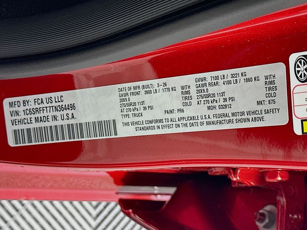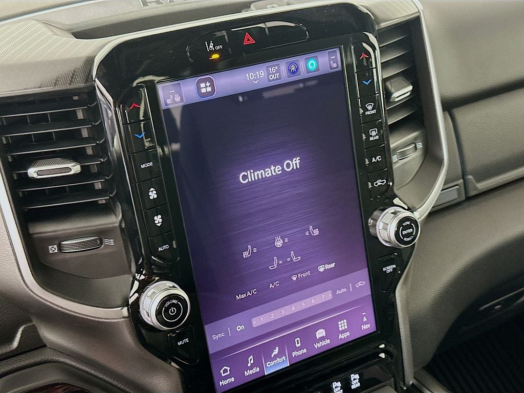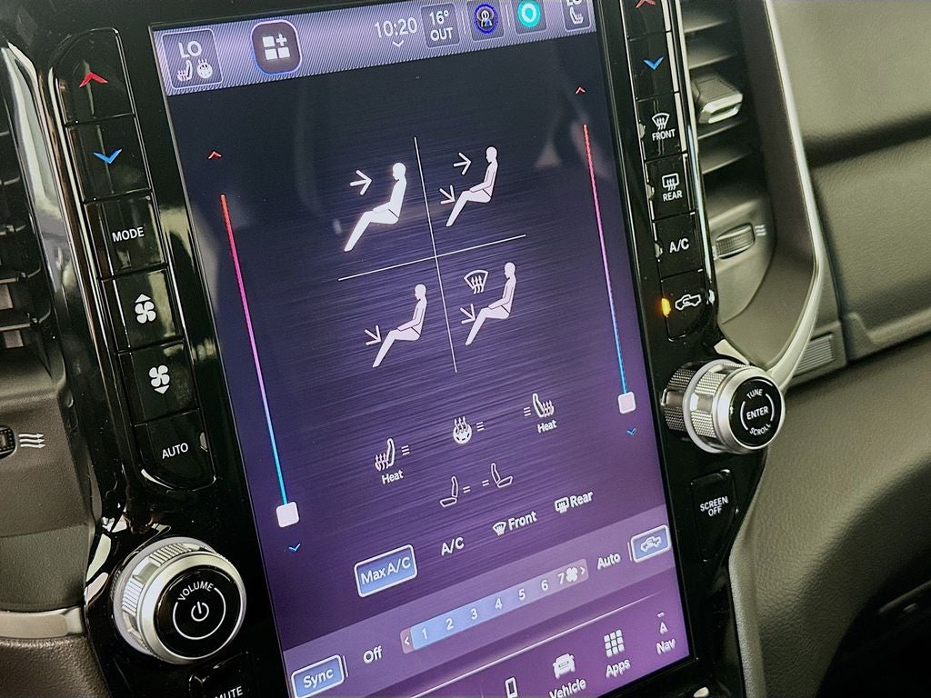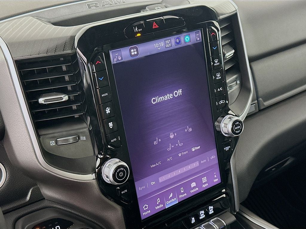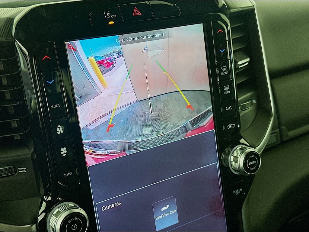 115V Auxiliary Power Outlet, 115V Auxiliary Rear Power Outlet, 12 Touchscreen Display, 2nd Row in Floor Storage Bins, 3 Rear Seat Head Restraints, 33 Gallon Fuel Tank, 4 Way Front Headrests, 4-Wheel Disc Brakes, 400W Inverter, 48V Belt Starter Generator, 4G LTE Wi-Fi Hot Spot, 6 Speakers, 9 Amplified Speakers with Subwoofer, ABS brakes, Air Conditioning, Air Conditioning ATC with Dual Zone Control, Alloy wheels, AM/FM radio, Anti-Spin Differential Rear Axle, Apple CarPlay, Apple CarPlay/Android Auto, Auto High-beam Headlights, Auto Power-Folding Mirrors, Auto-Dimming Exterior Driver Mirror, Auto-Dimming Rear-View Mirror, Big Horn Level 2 Equipment Group, Black Exterior Mirrors, Black Premium Power Mirrors, Body Color Fender Flares, Brake assist, Bucket Seats, Bumpers: chrome, Center Console Parts Module, Cloth Bucket Seats, Cluster 7.0 TFT Color Display, Compass, Configurable Drive Mode, Connected Travel and Traffic Services, Connectivity - US/Canada, Convex Wide-Angle Exterior Mirror Insert, Delay-off headlights, Deluxe Cloth Bucket Seats, Disassociated Touchscreen Display, Driver door bin, Dual front impact airbags, Dual front side impact airbags, Electronic Stability Control, Exterior Mirrors Courtesy Lamps, Exterior Mirrors with Heating Element, Exterior Mirrors with Supplemental Signals, Front anti-roll bar, Front Bucket Seats, Front Center Armrest w/Storage, Front fog lights, Front License Plate Bracket, Front reading lights, Front Seat Back Map Pockets, Front wheel independent suspension, Full Length Floor Console, Fully automatic headlights, Global Telematics Box Module, Glove Box Lamp, Google Android Auto, GPS Antenna Input, GPS Navigation, HD Radio, Heated door mirrors, Heated Front Seats, Heated Steering Wheel, Illuminated entry, Integrated Center Stack Radio, Integrated Voice Command with Bluetooth®, Leather Wrapped Steering Wheel, LED Dome Lamp with on/Off Switch, LED Footwell Lighting, Low tire pressure warning, Manual Adjust 4-Way Driver Seat, Manual Adjust 4-Way Front Passenger Seat, Manual Folding Exterior Mirrors, Media Hub with 2 Charge Only USBs, MOPAR Front and Rear Rubber Floor Mats, Occupant sensing airbag, Outside temperature display, Overhead airbag, Overhead console, Overhead LED Lamps, Panic alarm, ParkView Rear Back-Up Camera, Passenger door bin, Passenger vanity mirror, Power 2-Way Driver Lumbar Adjust, Power Adjust 8-Way Driver Seat, Power Adjustable Pedals, Power door mirrors, Power steering, Power windows, Premium Overhead Console, Quick Order Package 27Z Big Horn, Radio data system, Radio: Uconnect 5 Navigation with 12.0 Display, Radio: Uconnect 5 W with 8.4 Display, RAM Grille Badge - Chrome, Rear 60/40 Folding Seat, Rear anti-roll bar, Rear Center Armrest, Rear Power Sliding Window, Rear step bumper, Rear Window Defroster, Remote keyless entry, Remote Tailgate Release, Security Alarm, SiriusXM Radio Service, SiriusXM with 360L, Speed control, Steering Wheel Mounted Audio Controls, Sun Visors with Illuminated Vanity Mirrors, Supplier Part Tracking (J-1), Tachometer, Telescoping steering wheel, Tilt steering wheel, Traction control, Trailer Brake Control, Trip computer, Universal Garage Door Opener, USB Host Flip, Variably intermittent wipers, Voltmeter.