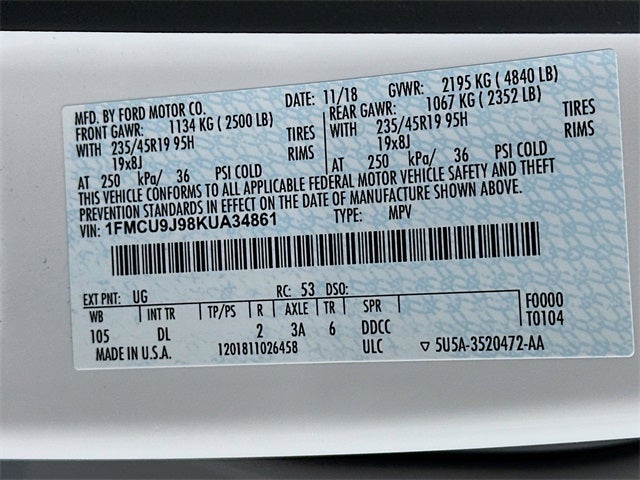 White Platinum 4WD 6-Speed Automatic EcoBoost 2.0L I4 GTDi DOHC Turbocharged VCT 4WD, Adaptive Cruise Control & Fwd Collision Warning, Auto High-Beam Headlamps, Blind Spot Info System w/Cross-Traffic Alert, Ford Safe and Smart Titanium Plus Package, Lane-Keeping System, Navigation System, Panoramic Vista Roof, Rain-Sensing Wipers, 10 Speakers, 3.07 Axle Ratio, 4-Wheel Disc Brakes, ABS brakes, Air Conditioning, Alloy wheels, AM/FM radio: SiriusXM, AppLink/Apple CarPlay and Android Auto, Auto-dimming Rear-View mirror, Automatic temperature control, Brake assist, Bumpers: body-color, Compass, Delay-off headlights, Driver door bin, Driver vanity mirror, Dual front impact airbags, Dual front side impact airbags, Electronic Stability Control, Emergency communication system: SYNC 3 911 Assist, Equipment Group 400A, Exterior Parking Camera Rear, FordPass Connect, Four wheel independent suspension, Front anti-roll bar, Front Bucket Seats, Front Center Armrest, Front dual zone A/C, Front fog lights, Front reading lights, Fully automatic headlights, Garage door transmitter, Heated door mirrors, Heated front seats, Heated Leather-Trimmed Front Bucket Seats, Heated steering wheel, High-Intensity Discharge Headlights, Illuminated entry, Knee airbag, Leather Shift Knob, Low tire pressure warning, Memory seat, Occupant sensing airbag, Outside temperature display, Overhead airbag, Overhead console, Panic alarm, Passenger door bin, Passenger vanity mirror, Power door mirrors, Power driver seat, Power Liftgate, Power passenger seat, Power steering, Power windows, Radio data system, Radio: AM/FM Stereo w/MP3 Capable, Rear anti-roll bar, Rear reading lights, Rear seat center armrest, Rear window defroster, Rear window wiper, Remote keyless entry, Roof rack: rails only, Security system, Speed control, Speed-sensing steering, Split folding rear seat, Steering wheel mounted audio controls, SYNC 3 Communications & Entertainment System, Tachometer, Telescoping steering wheel, Tilt steering wheel, Traction control, Trip computer, Turn signal indicator mirrors, Variably intermittent wipers, Voice-Activated Touchscreen Navigation System, Wheels: 19 Bright-Machined Aluminum, 4WD, Adaptive Cruise Control & Fwd Collision Warning, Auto High-Beam Headlamps, Blind Spot Info System w/Cross-Traffic Alert, Ford Safe and Smart Titanium Plus Package, Lane-Keeping System, Navigation System, Panoramic Vista Roof, Rain-Sensing Wipers.